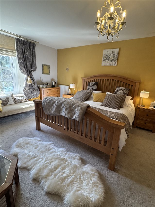 The en-suite consists of a Victorian roll top bath ,shower, and all the luxuries of a grand en-suite. Enjoying views up across the garden and to the fields beyond.