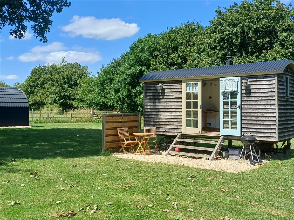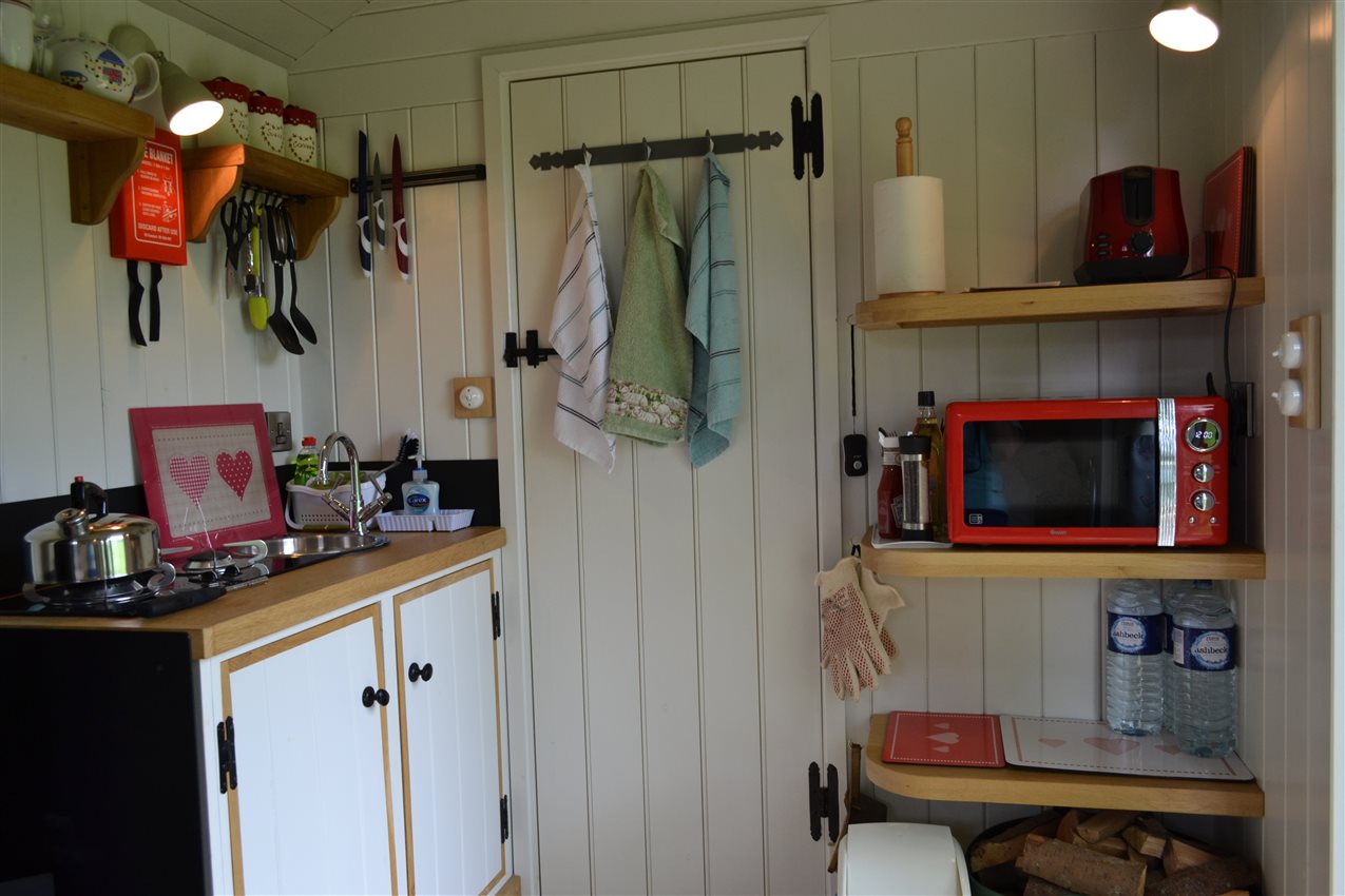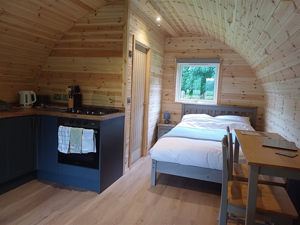 A double bed plus breakfast and chairs and sofa, a kitchen area and ensuite bathroom. The kitchenette has 4 ring gas hob and electric oven, under counter fridge and sink plus kettle and toaster. Outside you will find a BBQ, perfect for sunny day cooking, and you can gaze at the stars until the early hours (there is very little light pollution as the village does not have street lighting).